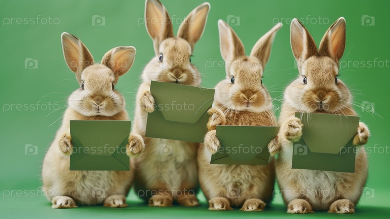 Милые кролики, держащие письма с пасхальными поздравлениями на зеленом фоне