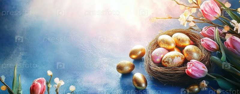 Пастельное гнездо золотые яйца тюльпаны, мягкий свет боке, рассеянные лепестки, блестящие акценты, уютное весеннее настроение, высококлассная студийная композиция с неглубокой глубиной, элегантно