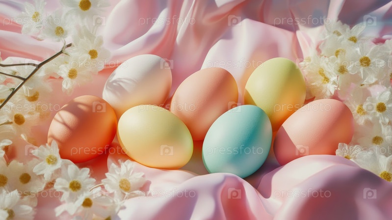 Сладкие воздушные оттенки. мягкие формы зефира на шелковой ткани сложные цветы. бархатные яйца зефира, опирающиеся на гладкую ткань с рассеянными цветами, создающие спокойную атмосферу