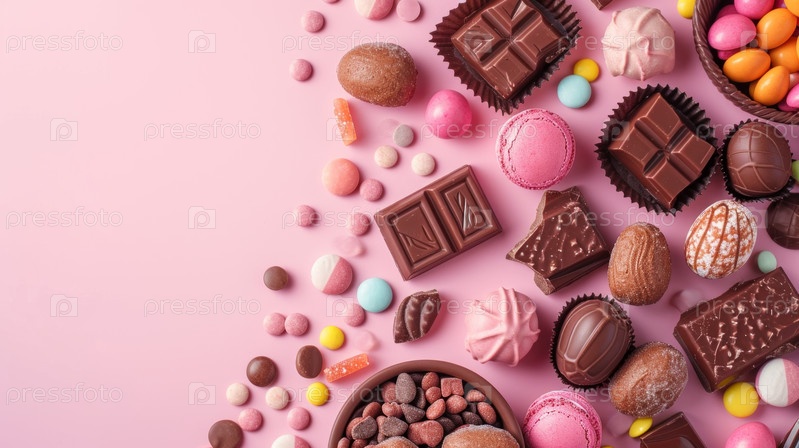 Ассортимент вкусного шоколада, конфет и красочных сладостей на светло-розовом фоне