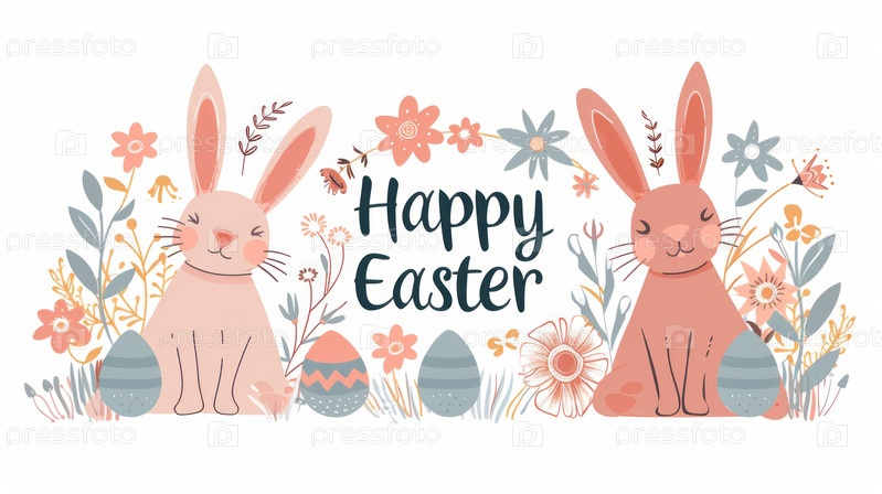 Модный пасхальный дизайн с типографией, кроликами, цветами, яйцами, ушами кролика в пастельных тонах