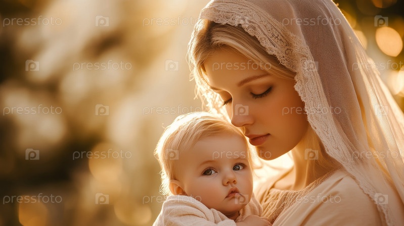 Красиво нежный момент, разделяемый между любящей матерью и ее драгоценным ребенком, Девой Марией и младенцем Иисусом