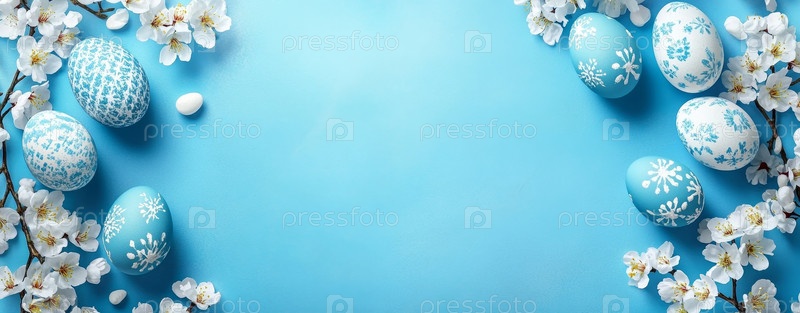 Пасхальные яйца и белые вишневые цветы на ярко-синем фоне. концепция "Счастливого Пасхи"; простой весенний шаблон, поздравительная открытка, баннер. lue