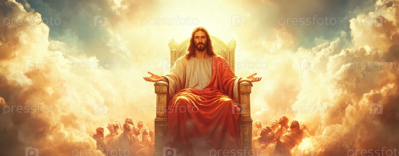 Иисус сидит на троне в небесах и приветствует своих последователей. Второе пришествие Иисуса Христа. Библейская сцена. Концепция христианской религии, яркий оптимистичный фон
