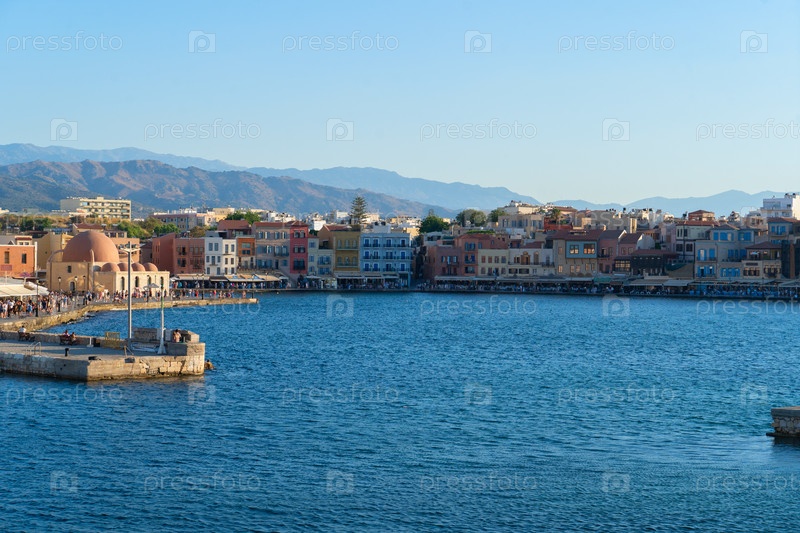 Венецианская гавань Хании с историческими домами в солнечный день, Крит, Греция
