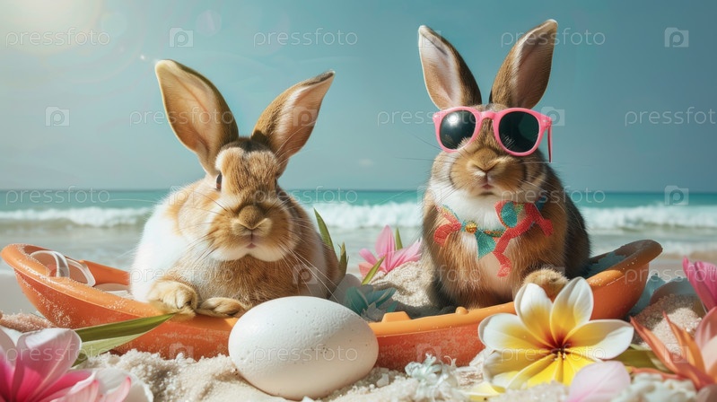 Два милых пасхальных кролика в солнцезащитных очках на отдыхе у пляжного побережья