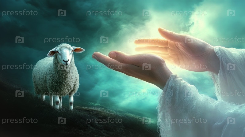 Концепция пастыря Иисуса, человек охраняющий своих овец