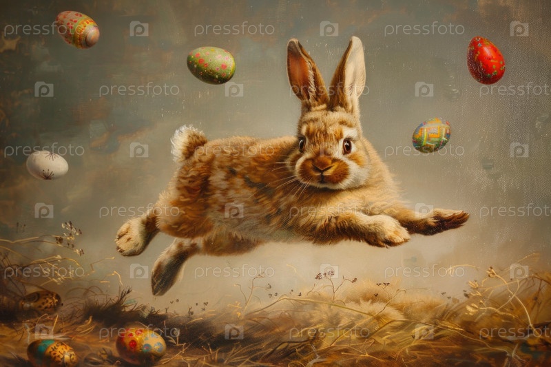 Веселый пасхальный кролик радостно прыгает, яйца в изобилии, празднуя торжества