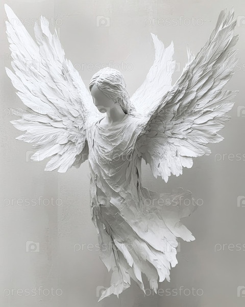 Потрясающе ошеломляющее монохромное изображение ангельской фигуры, демонстрирующей обширные, красивые и впечатляющие крылья