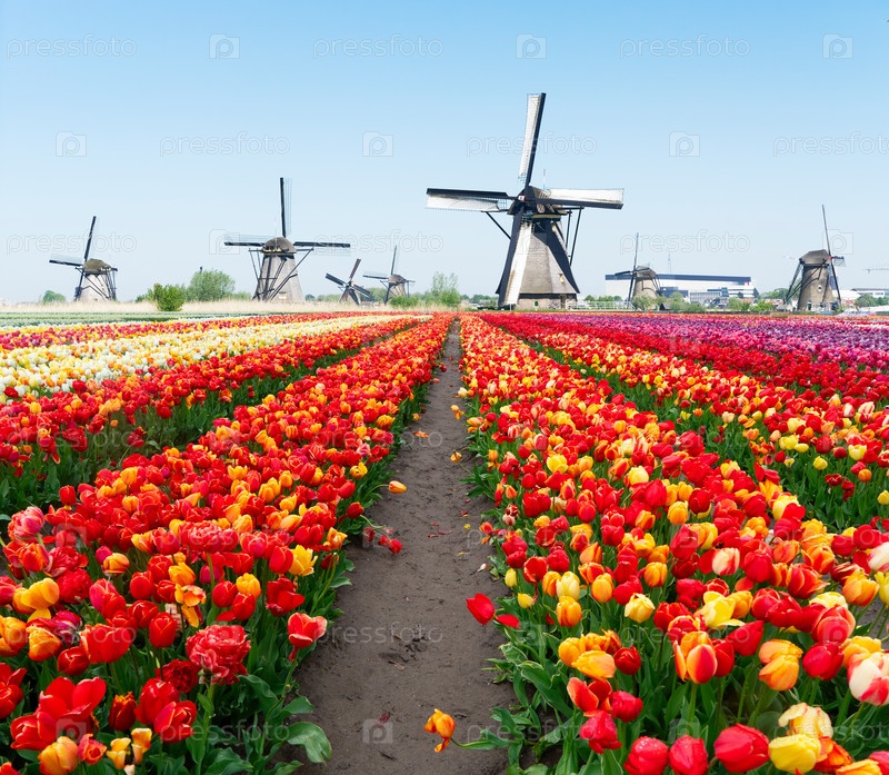 Голландские ветряные мельницы на поле цветов тюльпанов в солнечный день, Нидерланды