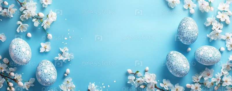 Пасхальные яйца и белые вишневые цветы на ярко-синем фоне