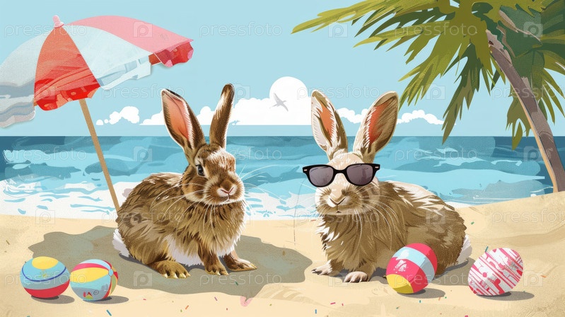 Два милых пасхальных кролика в солнцезащитных очках на отдыхе у пляжного побережья