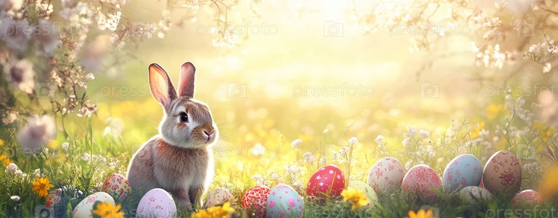 Очаровательный кролик с пасхальными яйцами на цветочной лужайке
