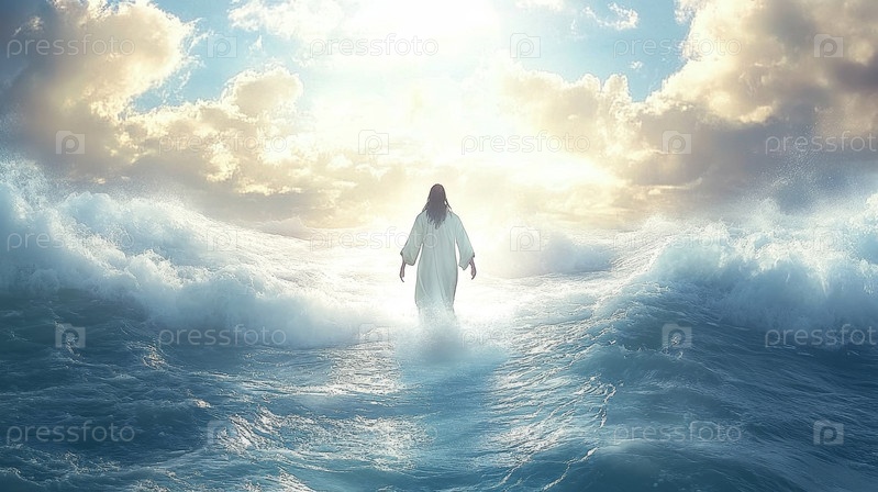 Духовная фигура, идущая по воде посреди огромного и бурного моря
