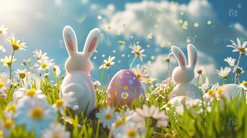 Пасхальный пейзаж, кролики с красочными яйцами и ромашками на лугу под прекрасным небом
