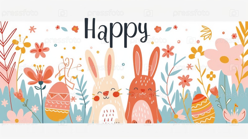 Модный пасхальный дизайн с типографией, кроликами, цветами, яйцами, ушами кролика, в пастельных тонах