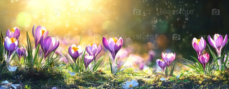 Пробуждение цветков рассвета. Мирное луг, наполненный рассеянными ранневековыми цветками сверкает. Нежное утреннее солнце нежно освещает розовые крокусы в спокойных пейзажах