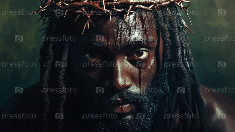 Черный Иисус в коронке из шипов с красными каплями на лице