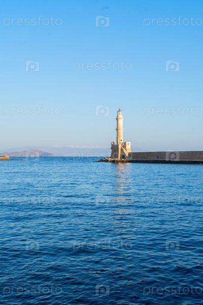 Залив Хании с морем и маяком на солнечном летнем закате, Крит, Греция, формат веб-баннера