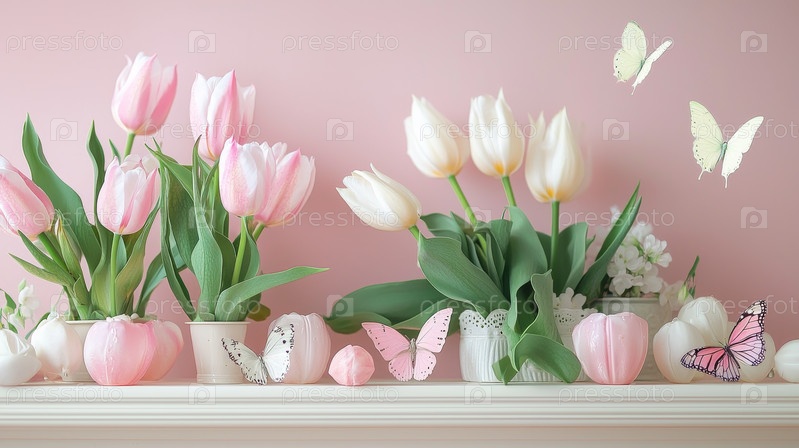 Весенняя тематика свежих тюльпанов, бабочек и светлых пастельных цветов, концепция "Счастливая Пасха"