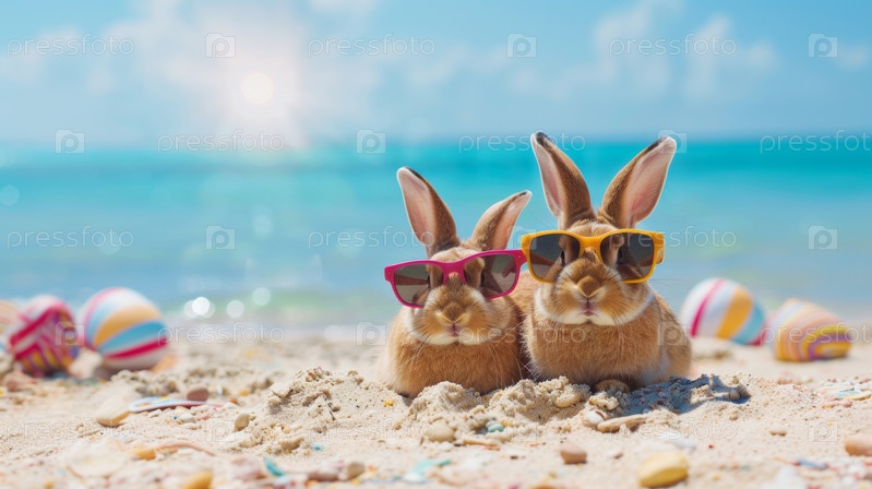 Два милых пасхальных кролика в отпуске на пляжном побережье