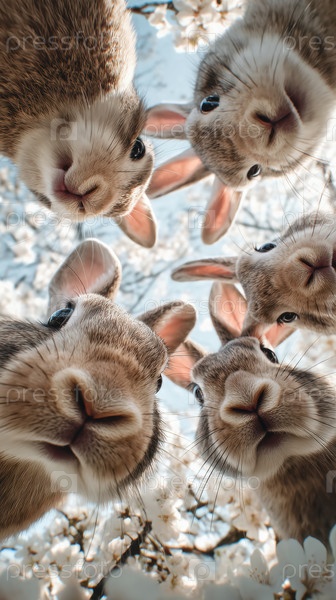 Очаровательная сцена кроликов в солнечной цветочной обстановке Интимная фотография, захватывающая игривых кроликов среди ярких весенних цветков и яркого солнечного света
