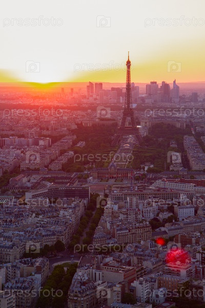 Эйфелева башня и Парижский городской пейзаж сверху в оранжевом закате солнечного света, Франция