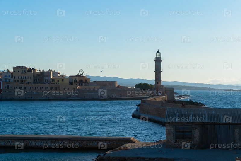 Залив Хании с морем и маяком на солнечном летнем закате, Крит, Греция, формат веб-баннера