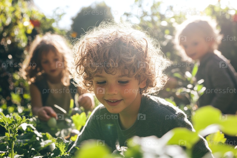 Дети участвуют в охоте на пасхальные яйца в солнечном саду