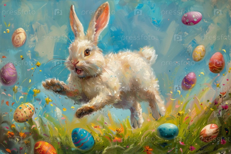 Веселый пасхальный кролик радостно прыгает, яйца в изобилии, празднуя торжества