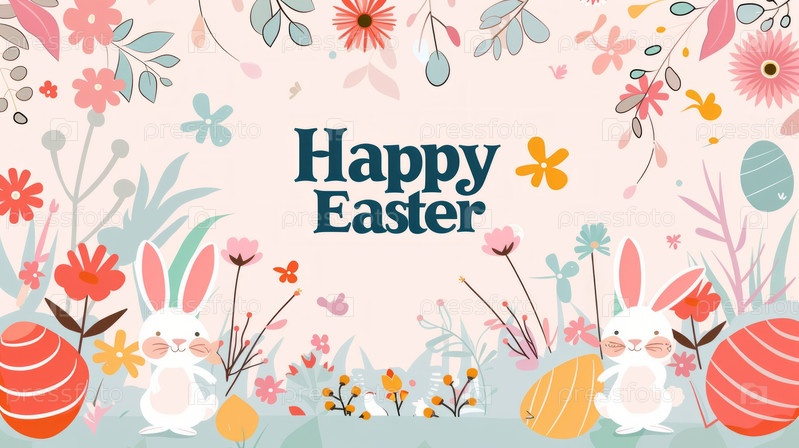 Модный пасхальный дизайн с типографией, кроликами, цветами, яйцами, ушами кролика, в пастельных тонах