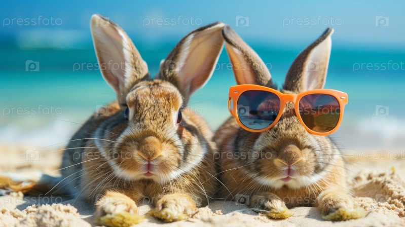 Два милых пасхальных кролика в отпуске на пляжном побережье
