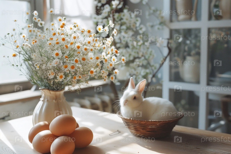 Стол украшен на Рождество кроликом и яйцами