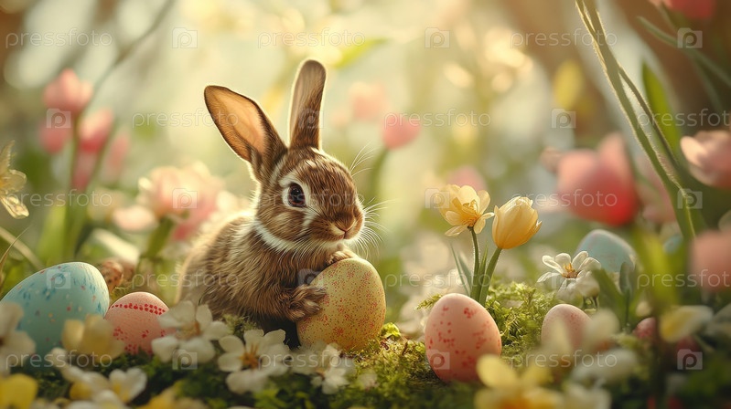 Пасхальный пейзаж, кролики с красочными яйцами и ромашками на лугу под прекрасным небом