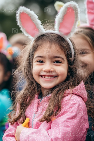 Пять радостных и веселых девочек в красочных кроличьих ушах счастливо празднуют Пасху в яркой атмосфере на открытом воздухе