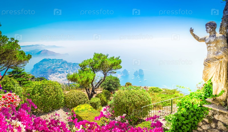 Вид на море и сад с горы Соларо острова Капри, Италия