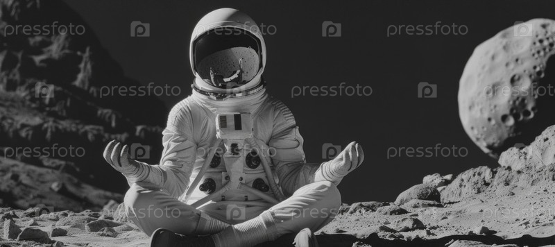 Изображение астронавта - мужчина или женщина в костюме с шлемом, медитирующие на лунной поверхности