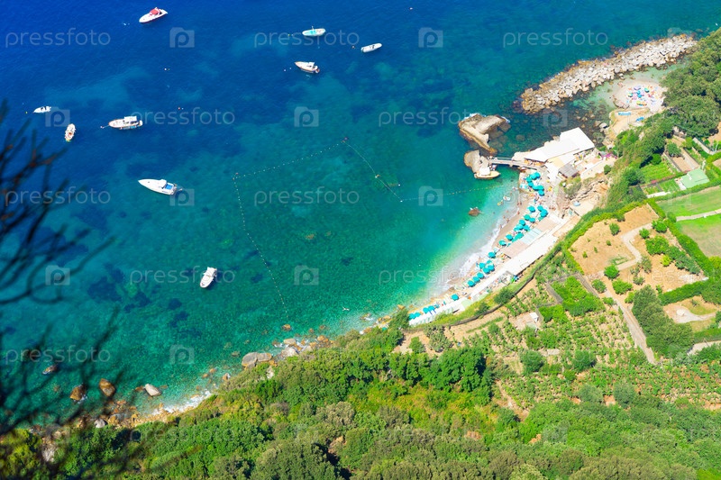 Воды Тирренского моря с побережьем, вид с воздуха , остров Капри, Италия