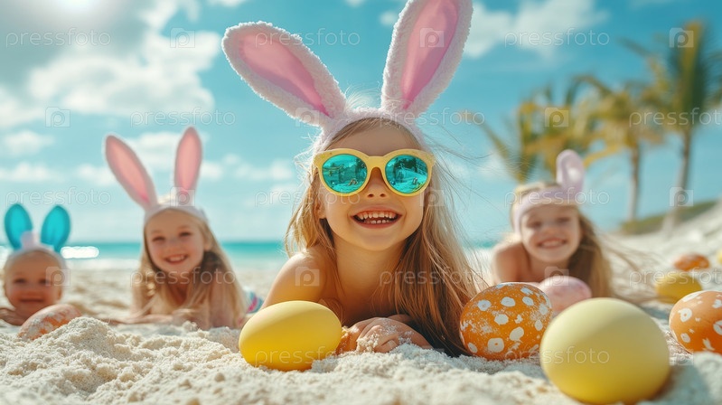 Дети с радостью празднуют Пасху на красивом пляже, окруженные красочными яйцами и носящие кроличьи уши