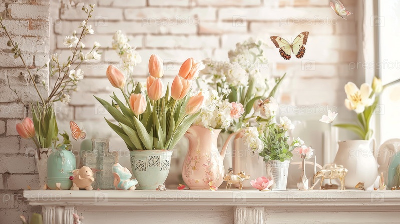 Свежие тюльпаны, бабочки и светлые пастельные цвета Концепция "Счастливая Пасха"