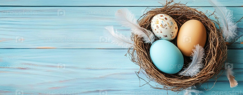 Пасхальные яйца, перья в гнезде на голубом деревянном фоне, копировальное пространство