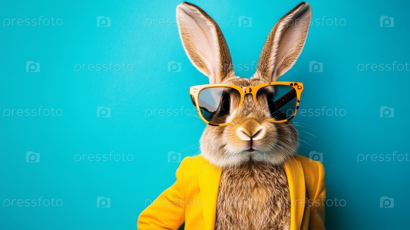 Красочно одетый кролик в солнцезащитных очках позирует на розовом и зеленом фоне, куртка с тропическим принтом, расплывчатые уши, гладкий стиль, студийное освещение