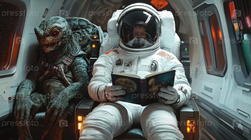 Астронавт делится уютным моментом с загадочными фигурами в космическом корабле, погруженный в книгу среди звезд