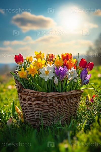 Яркая и красочная весенняя цветовая корзина, красиво размещенная на пышном и зеленом поле в течение сезона
