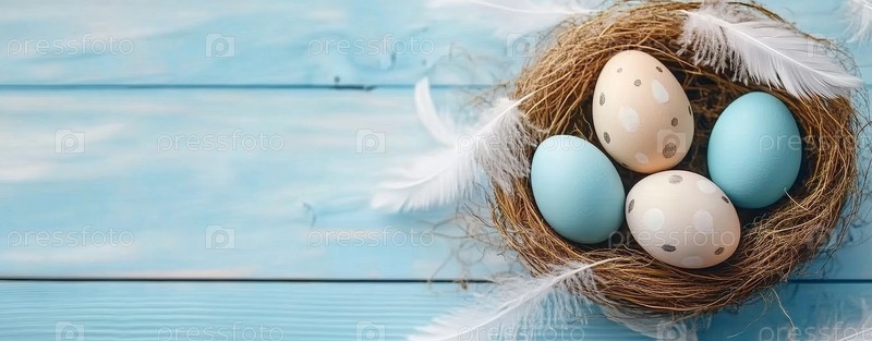 Пасхальные яйца, перья в гнезде на голубом деревянном фоне, копировальное пространство