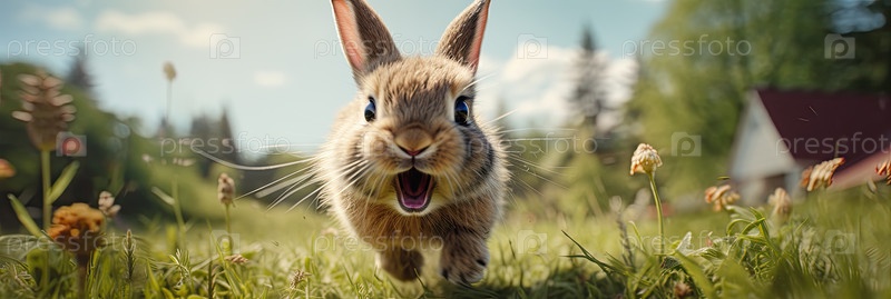 Кролик бежит по газону на фоне солнечной лужайки,