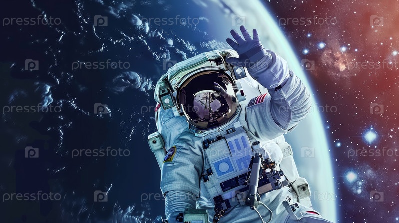 Космонавт в космическом пространстве машет правой рукой в знак приветствия
