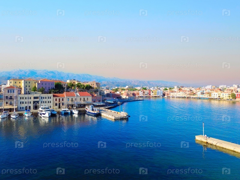 Залив Хании с морем и маяком на солнечном летнем закате, Крит, Греция