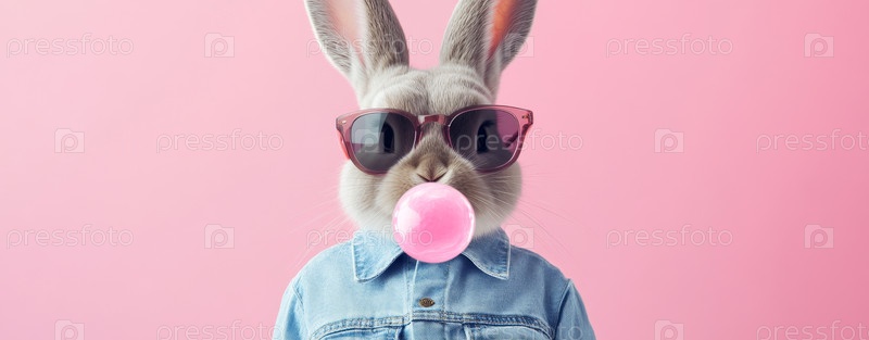 Стильный кролик в джинсовой рубашке и солнцезащитных очках, дующий розовый пузырь из жвачки