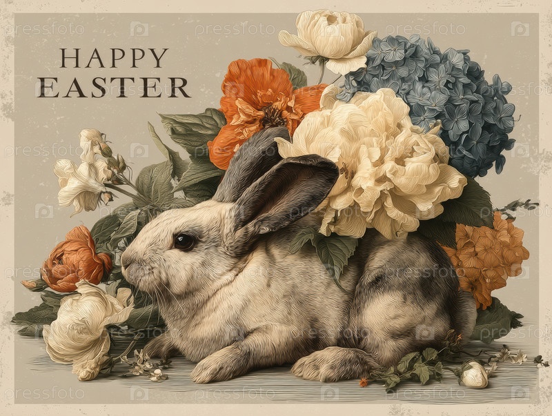 Ретро Пасхальный кролик. старомодный пасхальный зайчик среди пышного цветочного кластера в мягких оттенках. винтажный пастырский кролик, расположенный внутри массива деликатных весенних цветных рисунков